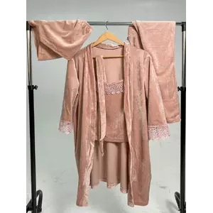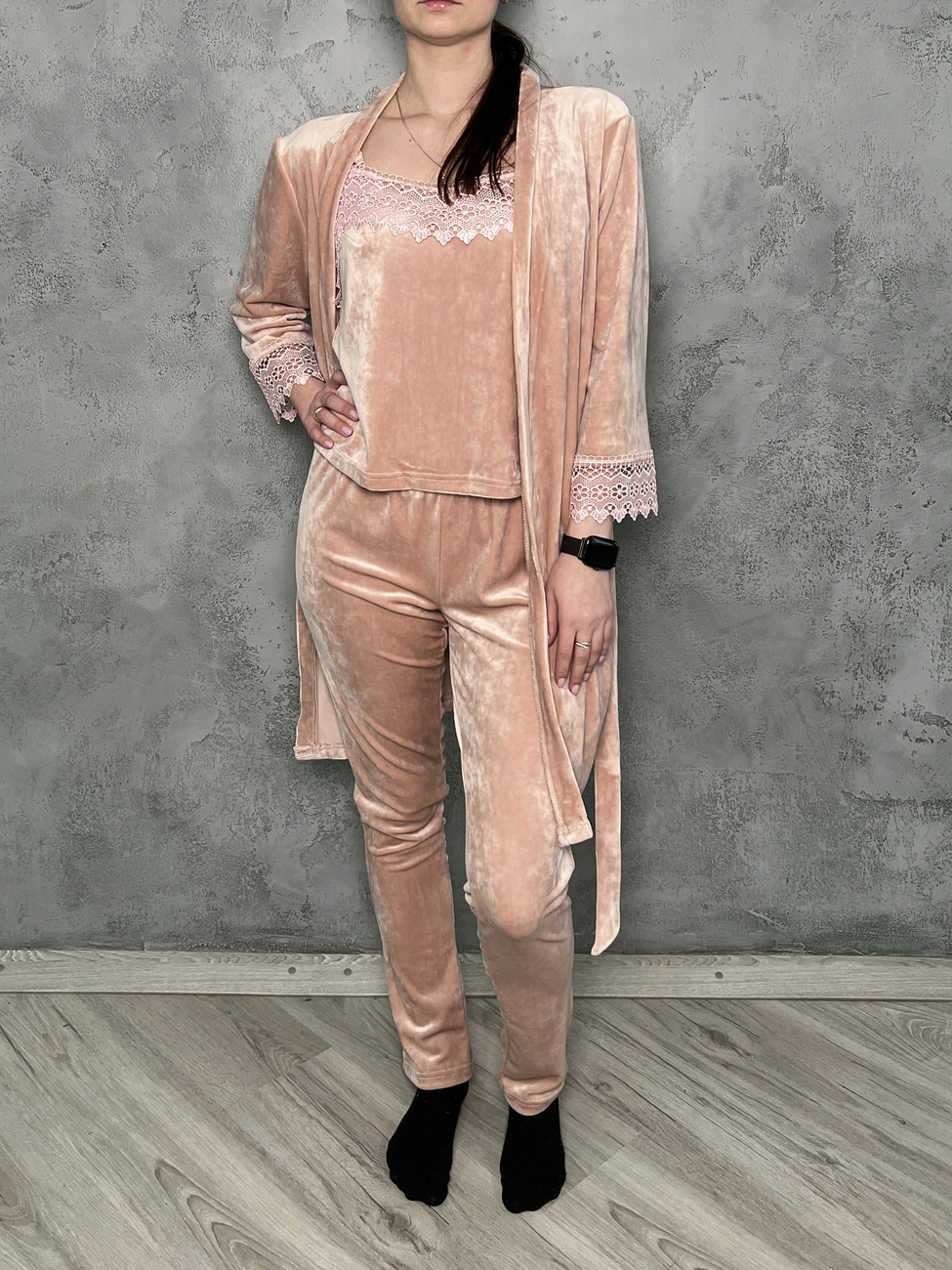 Жіноча піжама 4 в 1 ( штани, халат, майка та шорти ) відшита з міцної тканини, стійкої до механічних впливів, має хорошу теплоізоляцію. Відмінно пропускає повітря, не втрачає привабливий зовнішній вигляд і форму протягом тривалого часу. Одяг з велюру не потрібно прасувати, оскільки тканина не мнеться.